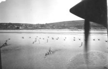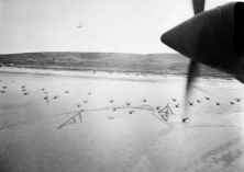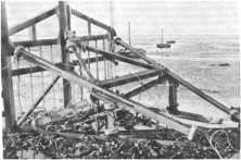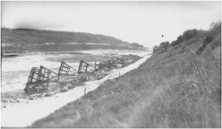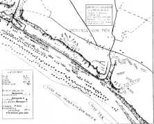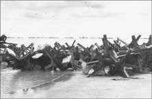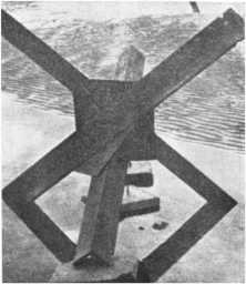 1120 Les obstacles sur la plage de Vierville La première ligne d'obstacles consistait en une série d' "éléments C ", parfois appelés "portes belges", structures en forme de barrières (récupérées des défenses de campagne belges, dites éléments Cointet), avec cadre renforcé et supports en fer, montées sur rouleaux. Elle était située à environ 250 m. de la ligne de marée haute. Les principales poutrelles de support avaient 3,3m. de haut. Des mines antichar "Tellerminen" étanches étaient fixées au sommet des poutrelles verticales. La seconde ligne, de 20 à 25 m plus près de la terre, était composée de gros pieux en bois enfoncés dans le sable à un angle tel que leur extrémité, minée, pointait vers la mer. Parfois on trouvait des rampes inclinées formées de troncs de bois, renforcées et minées. A 130 m de la laisse de haute mer, la dernière rangée d'obstacles était composée de hérissons, (parfois appelés hérissons tchèques) d'environ 1,70m. de haut, formés d'au moins 3 rails d'acier ou de cornières, croisés en leur milieu et si solides que leurs extrémités pouvaient perforer le fond des péniches de débarquement.