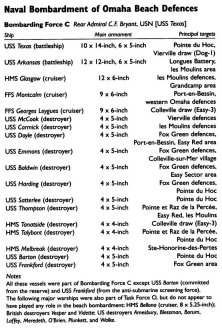 Le bombardement naval devait durer de 5h50 à 6h27 (H-40 à H-3). Il devait être assuré par de nombreux de navires de tous types, groupés en "Fire Support Group", FSG (groupes d'appui de feu). Ces FSG étaient également chargés de bombarder les défenses de Colleville et la batterie à longue portée de Longues (4 canons de 150mm) qui pouvait intervenir sur la flotte en mer.