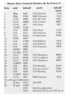 Les affectations des groupe de contrôle à terre des tirs de la marine. En principe, à chaque bataillon était affecté un groupe NFCP (Navy Fire Control Party) en liaison avec un navire de guerre