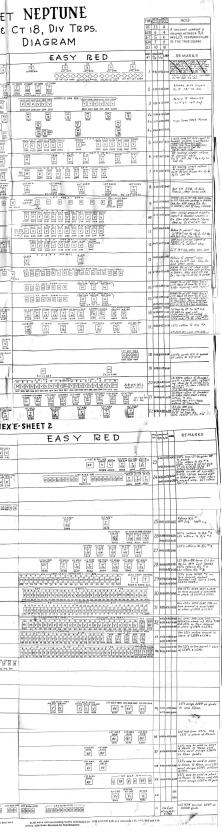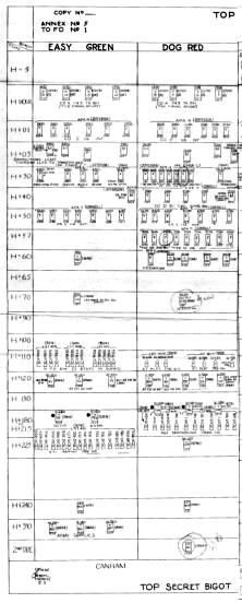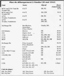 (détails) Le diagramme des débarquements prévus. Les 2 colonnes de gauche indiquent les secteurs Dog Red et Easy Green, c'est-à-dire de D3(St-Laurent) à E1(Le Ruquet)