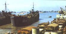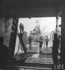 Un Sherman de la 2ème DBUS sort d'un LST sur la